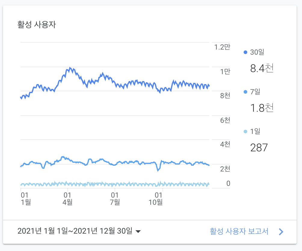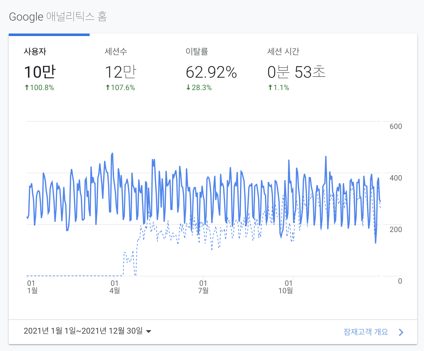 2021년 1월 1일부터 2021년 12월 30일까지 총 10만 명(근삿값)이 devowen.com을 방문해 주셨다.(감사합니다!) daily로 보면 그래프로는 200~400 을 왔다갔다 한다. 주중에는 보통 올라가고 주말에는 내려간다.