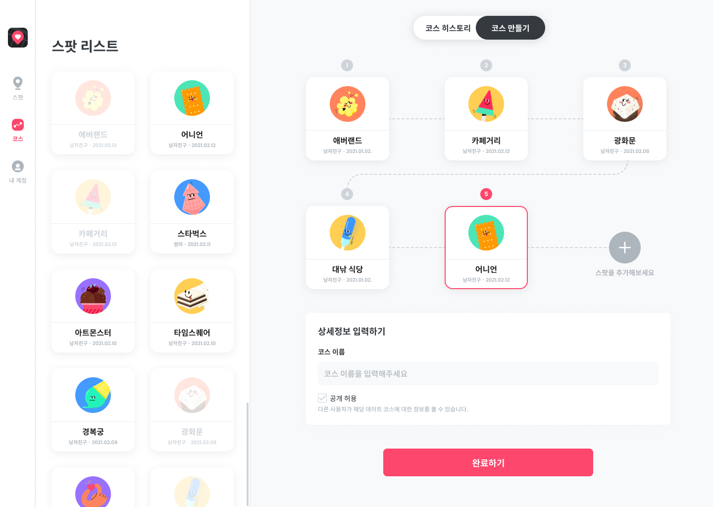 연초에 넥스터즈(Nexters)라는 IT 연합 동아리 활동을 했었다. 넥스터즈는 학생 그리고 현직자로 이루어져 있고 개발자와 디자이너가 한 팀이 되어서 프로젝트를 하는 활동이다. 코로나라 전부 온라인으로 진행되었으며 겨울 기간동안 팀을 꾸려서 사이드 프로젝트를 진행했다. 우리 팀은 데동여지도(dedong)라는 커플들의 데이트 코스 저장 어플리케이션을 만들었다. 나는 이 프로젝트에서 PM과 웹 프론트엔드 개발을 맡아서 진행했다. 넥스터즈 18기 기간에 전체 팀들 중 3등을 하고 이후에도 계속 디벨롭을 진행하고 있다. 언젠가는 릴리즈 되겠지.. 코로나 끝나면...? ㅋㅋㅋ