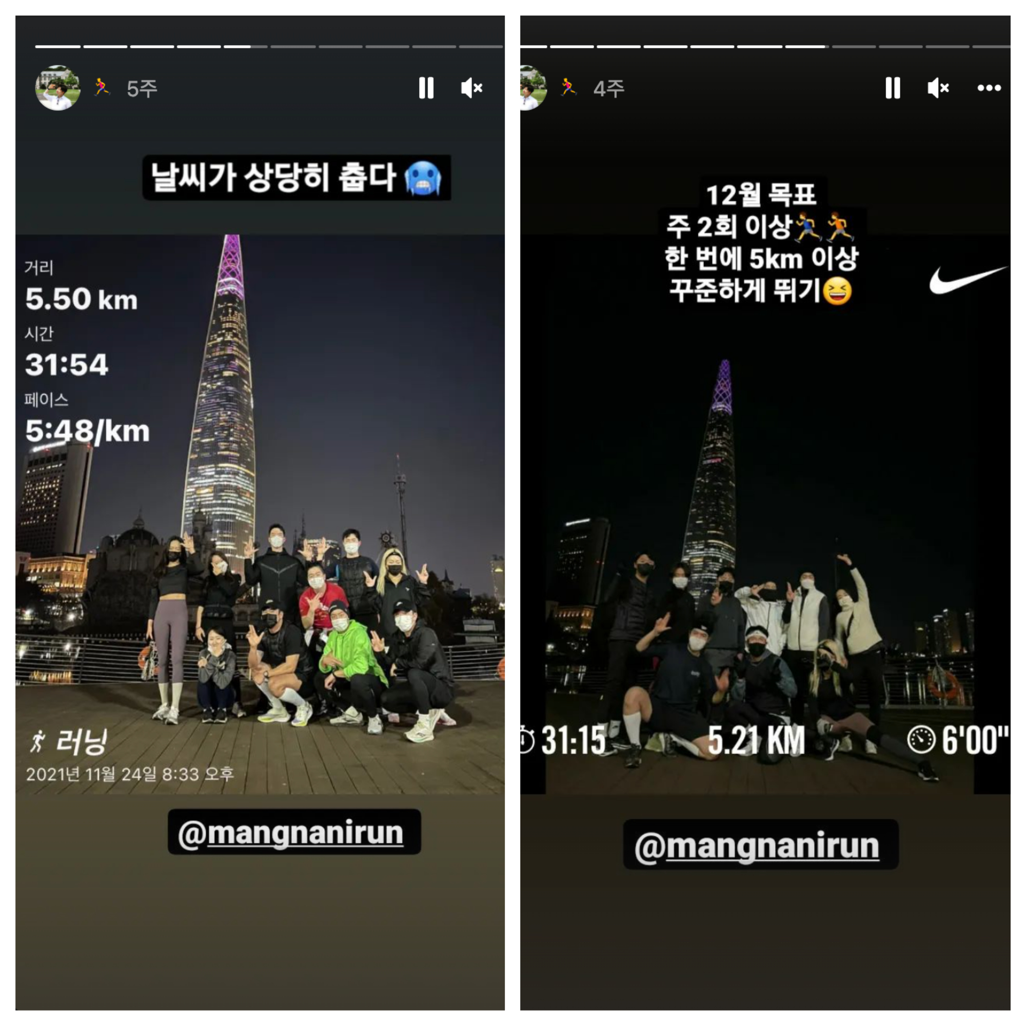 운동을 쉬다 보니 몸이 또 근질근질 거려서 혼자 한강을 뛰기 시작했다. 그러다가 친구가 알려준 동네 러닝크루를 가을에 들어가게 되었고, 지금까지 여기 러닝크루 분들과 재밌게 러닝하고 있다. 확실히 혼자 뛰는 것보다 여럿이서 같이 뛰는게 더 꾸준하게 오래 뛸 수 있는 것 같다. 러닝 크루다 보니 몸과 마음이 건강한 분들이 참 많아서 좋다!