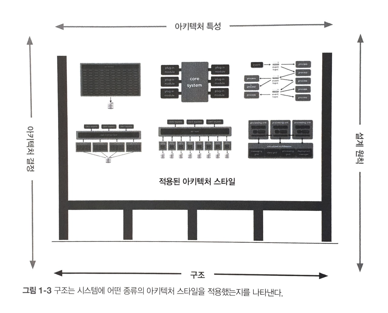 아키텍처는 아키텍처 특성(architecture characteristic), 아키텍처 결정(architecture decision), 설계 원칙(design principle)이 결합된 구조다(structure). 시스템의 구조란 시스템이 구현된 (마이크로서비스, 레이어드, 마이크로 커널 같은) 아키텍처 스타일(들)의 종류를 말한다. 시스템의 아키텍처를 완전히 이해하려면 아키텍처 특성, 아키텍처 결정, 설계 원칙도 알아야 한다. p28~29