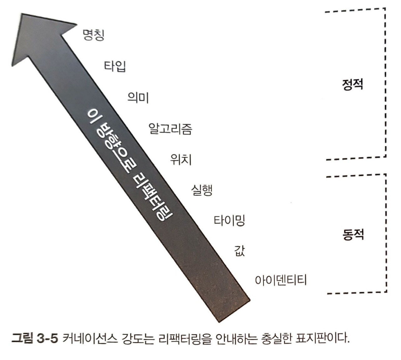 - 강도 : 아키텍트는 개발자가 어떤 유형의 커네이선스를 얼마나 쉽게 리팩터링 할 수 있는지에 따라 커네이선스 강도(strength)를 결정한다. 아래 그림처럼, 다양한 유형의 커네이선스가 더 바람직하다. 아키텍트와 개발자는 더 나은 유형의 커네이선스를 리팩터링해서 코드베이스의 커필링 특성을 개선할 수 있다.