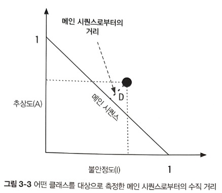 메인 시퀀스로부터의 거리는 아키텍처 구조를 평가하는 몇 가지 전체적인 메트릭 중 하나로, 불안정도와 추상도를 이용하여 계산한다.