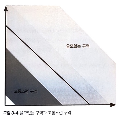위의 그래프에서 개발자는 후보 클래스를 그려보고 이상적인 선에서 얼마나 떨어져 있는지 거리를 잰다. 이 선에 가까울 수록 클래스 균형이 잘 맞다는 방증이다. 오른쪽 위로 치우친 부분을 쓸모없는 구역(zone of uselessness, 너무 추상화를 많이 해서 사용하기 어려운 코드), 반대로 왼쪽 아래로 치우친 부분을 고통스런 구역(zone of pain, 추상화를 거의 안 하고 구현 코드만 잔뜩 넣어 취약하고 관리하기 힘든 코드)이라고 한다.