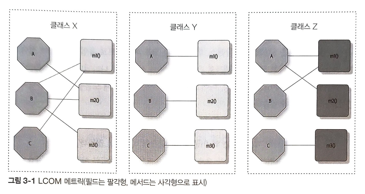 기본적으로 LCOM 메트릭은 클래스 내부의 부차적인 커플링을 나타내는데, 다음과 같이 정의하면 좀 더 이해하기 쉽다.