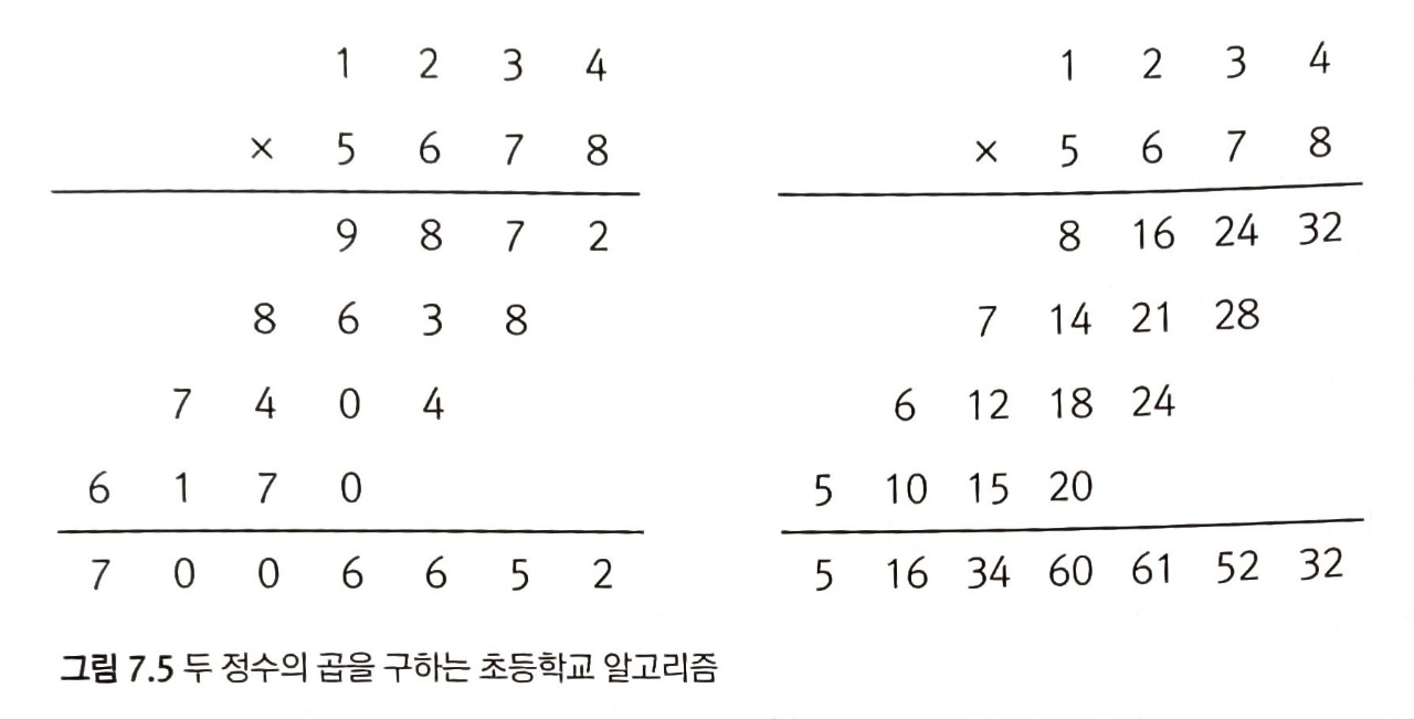 이 방법에서 우리는 큰 정수 두 개를 한 번 곱하는 대신, 절반 크기로 나눈 작은 조각을 네 번 곱한다. 이대로 각각을 재귀 호출해서 해결하면 분할 정복 알고리즘이라고 할 수 있다. 이 방법의 시간복잡도는 계산해 보면 O($n^2$)이 된다. 결국 시간복잡도가 줄어들지 않았으므로 의미가 없다.