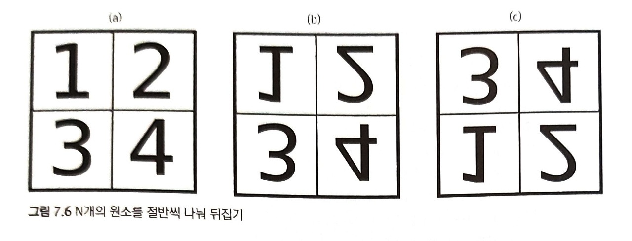 그림 7.6은 이 병합 과정을 어떻게 해야 할지 보여준다. 원본 그림을 4등분 해서 각 부분을 그림 (a)와 같이 1,2,3,4로 부르기로 했다고 가정하자. 이 때 재귀 호출을 이용해 네 부분을 각각 상하로 뒤집은 압축 결과를 얻었다고 하자. 각 부분을 합치면 (b)와 같이 각 부분이 상하로 뒤집힌 그림이 된다. 여기에서 위 두 조각과 아래 두 조각을 각각 바꾸면 그림 (c)를 얻을 수 있는데, 이것이 애초에 우리가 원하던 전체가 뒤집힌 그림이 된다. 이 아이디어에 기초에 코드를 작성하면 아래와 같다.