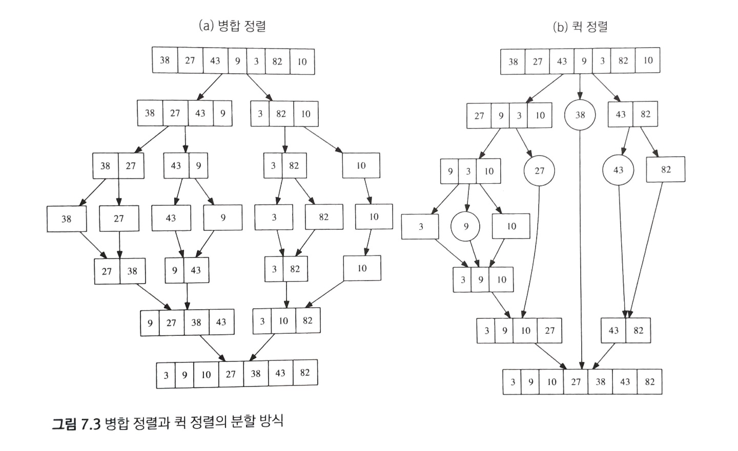 아래 그림은 병합 정렬과 퀵 정렬의 분할 방식을 보여주는 그림이다.