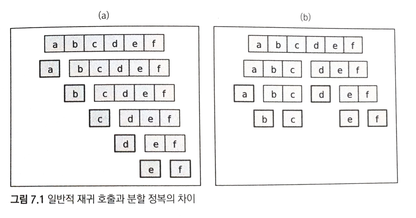 분할 정복이 일반적인 재귀 호출과 다른 점은 문제를 한 조각과 나머지 전체로 나누는 대신 거의 같은 크기의 부분 문제로 나누는 것이다. 이 차이점이 아래 그림이다. 그림 (a)는 항상 문제를 한 조각과 나머지로 쪼개는 일반적인 재귀 호출 알고리즘을 보여주고, 그림 (b)는 항상 문제를 절반씩으로 나누는 분할 정복 알고리즘을 보여준다.