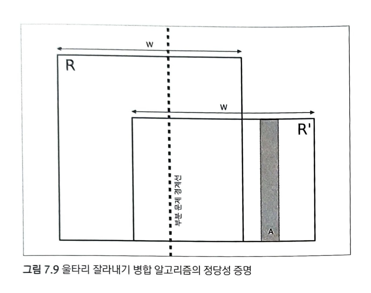 R과 R’은 둘 다 부분 문제 경계에 있는 두 개의 판자를 포함하므로 항상 겹치는 부분이 있다. R이 R’보다 높으므로, R에 포함된 모든 판자들은 당연히 A보다 높아야 한다. 우리의 알고리즘은 현재 사각형의 양쪽 끝에 있는 두 판자 중 항상 더 높은 것을 선택하므로, A보다 낮거나 높이가 같은 판자를 만나야만 A를 선택하게 된다. 그런데 R’을 만드는 과정에서 만나는 반대쪽 판자들은 모두 R에 속해 있으므로 A보다 높다. 따라서 A를 선택하는 경우가 있을 수 없으며, R이 R’보다 높다는 우리의 가정이 모순이라는 사실을 알게 된다. 이렇게 위의 코드에서 고려하는 사각형 중에 반드시 최대 사각형이 있다는 것을 증명할 수 있다.