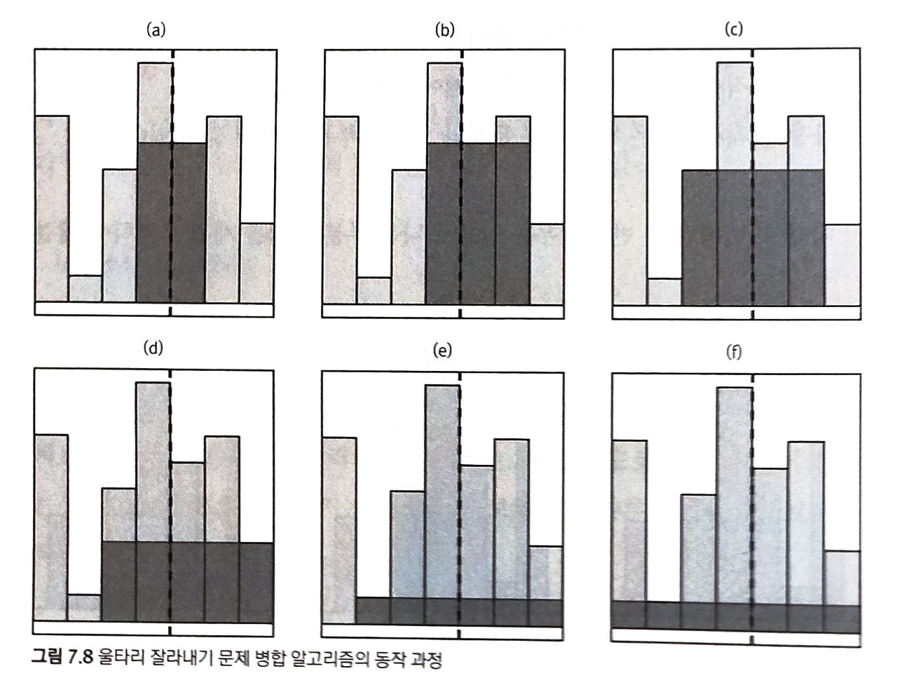 양쪽 부분 문제에 모두 걸치는 직사각형 중 가장 큰 것을 찾는 방법은 더 높은 오른쪽 판자를 포함하게끔 확장하는 것이다. 가장 큰 사각형을 찾으려면 항상 사각형의 높이를 최대화 하는 방향으로 확장해야 한다. 아래 그림은 예제 입력에서 어떠한 순서대로 사각형을 고려해야 하는지를 보여준다.