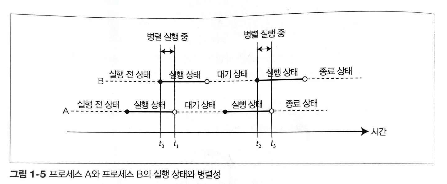 병렬성(parallelism)은 같은 시각에서 여러 프로세스가 동시에 계산을 실행하는 상태를 의미한다. 아래 그림은 프로세스 A와 B의 상태 전이를 시간 축 위에 나타낸 것으로 프로세스 A와 B가 병렬 실행되는 시간을 표시한 것이다. 이 예에서는 시각 t < $t_0$ ≤ t < $t_1$, $t_2$ ≤ t < $t_3$ 일 때 프로세스 A와 프로세스 B가 모두 실행되고 있으므로 시각 t에서 프로세스 A와 프로세스 B는 병렬 실행 중이라고 할 수 있다.