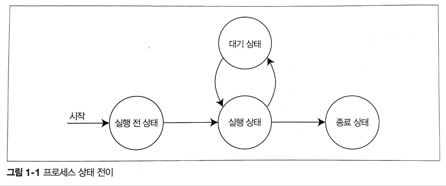 그림에서 알 수 있듯이 프로세스의 상태는 실행 전 상태에서 시작해 실행 상태, 대기 상태를 거쳐 종료 상태로 전이한다. 즉, 프로세스는 항상 실행 상태인 것이 아니라 실행 전 상태에서 종료 상태로 전이하는 도중에 대기 상태가 될 수도 있다. 대기 상태로 전이하는 이유는 다음 세 가지다.