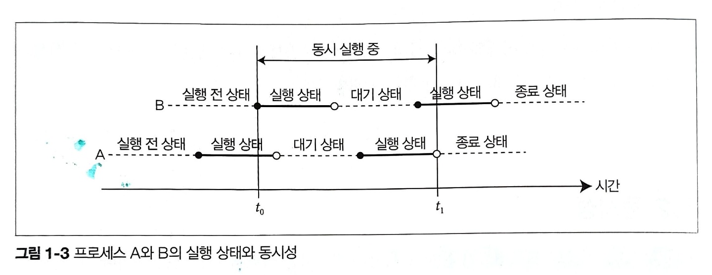 위 예에서 프로세스 A가 프로세스 B보다 먼저 실행 전 상태에서 실행 상태로 전이하며, 먼저 종료 상태로 전이한다. 따라서 앞의 정의에 따라 A, B 두 프로세스가 계산 중 상태인 시간 t | $t_0$ ≤ t < $t_1$일 때 프로세스 A와 프로세스 B는 동시에 실행 중이라 할 수 있다.