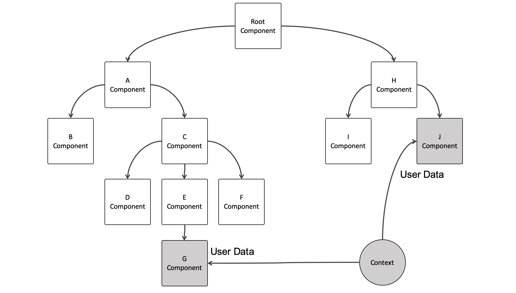 만약 여기서 G Component에서 데이터를 추가했고 그 값을 J Component에서 사용한다면 어떻게 해야 할까? G → E → C → A → Root → H → J 이렇게 가야 할 것이다. 여기에서 컴포넌트 구조가 더 깊어진다면..? 그러면 데이터는 더 먼 길을 돌아서 하나의 컴포넌트에서 다른 컴포넌트로 이동을 하게 되며 이는 성능 저하 이슈를 일으킬 수 있다.