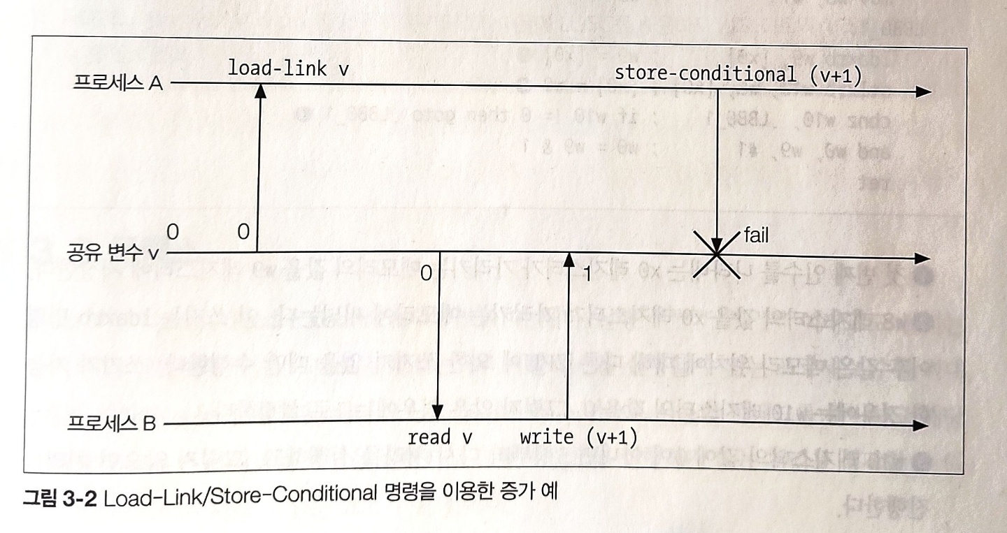 LL 명령은 메모리 읽기를 수행하는 명령이지만 읽을 때 메모리를 배타적으로 읽도록 지정한다. SC 명령은 메모리 쓰기를 수행하는 명령이며, LL 명령으로 지정한 메모리로의 쓰기는 다를 CPU가 수행하지 않는 경우에만 쓰기가 성공한다.