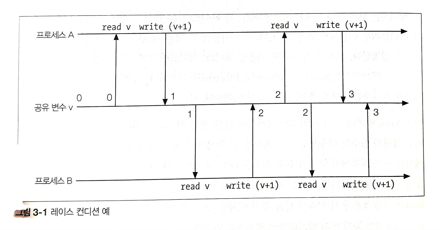 예를 들어 공유 메모리 상에 있는 변수를 여러 프로세스가 증가시킨다고 가정하자. 이 때 메모리에 읽기와 쓰기를 동시에 수행할 수는 없고, 각각 다른 타이밍에 수행한다고 가정한다. 아래 그림은 프로세스 A, B가 공유 변수 v를 증가시키는 예시이다.