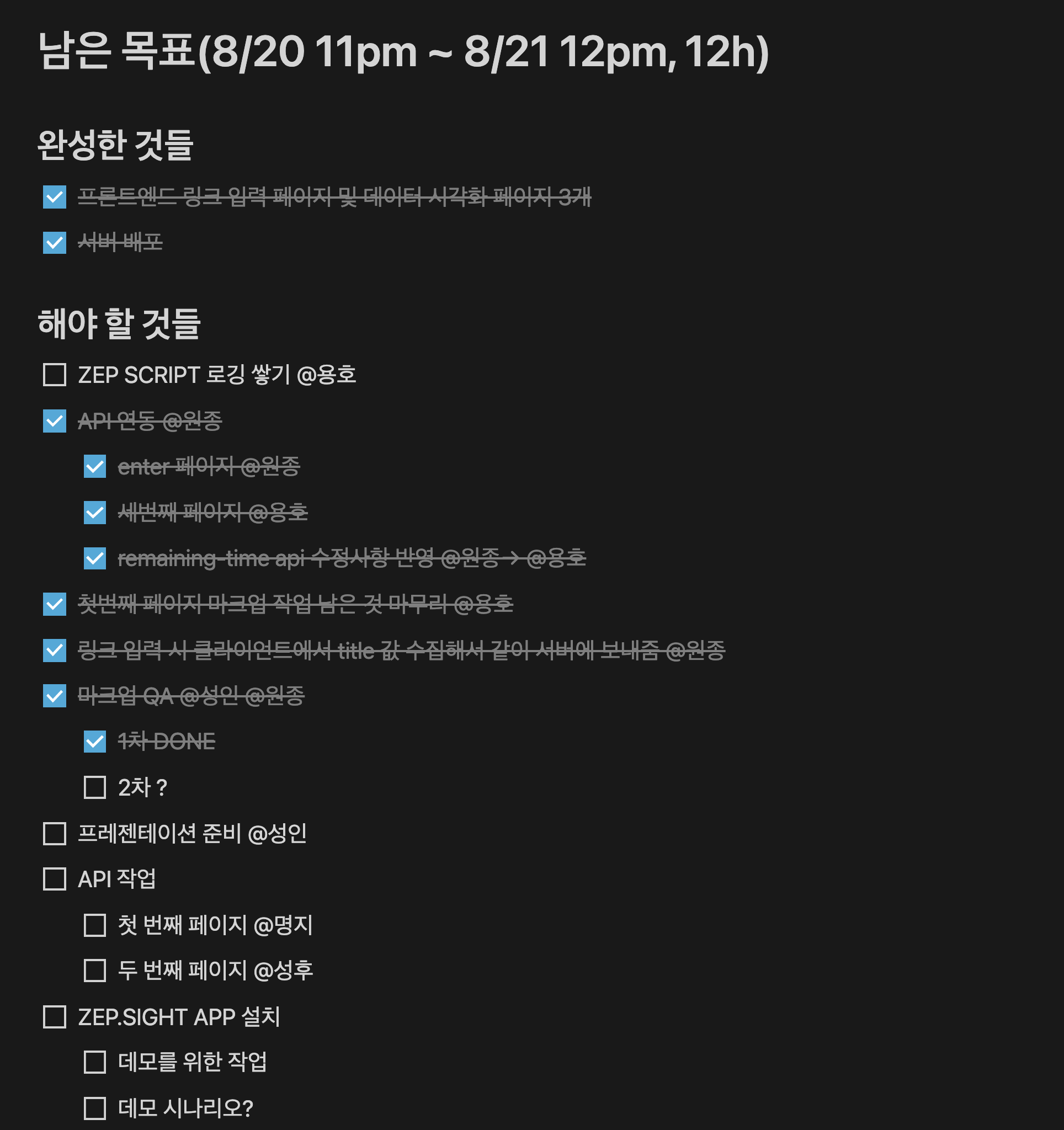 둘째날 새벽에는 이제 남은 시간이 얼마 남지 않았기에 지금까지 작업한 내용을 한 번 마무리를 하고, 앞으로 남은 작업들에 대해서 우선순위와 R&R을 나누었다.