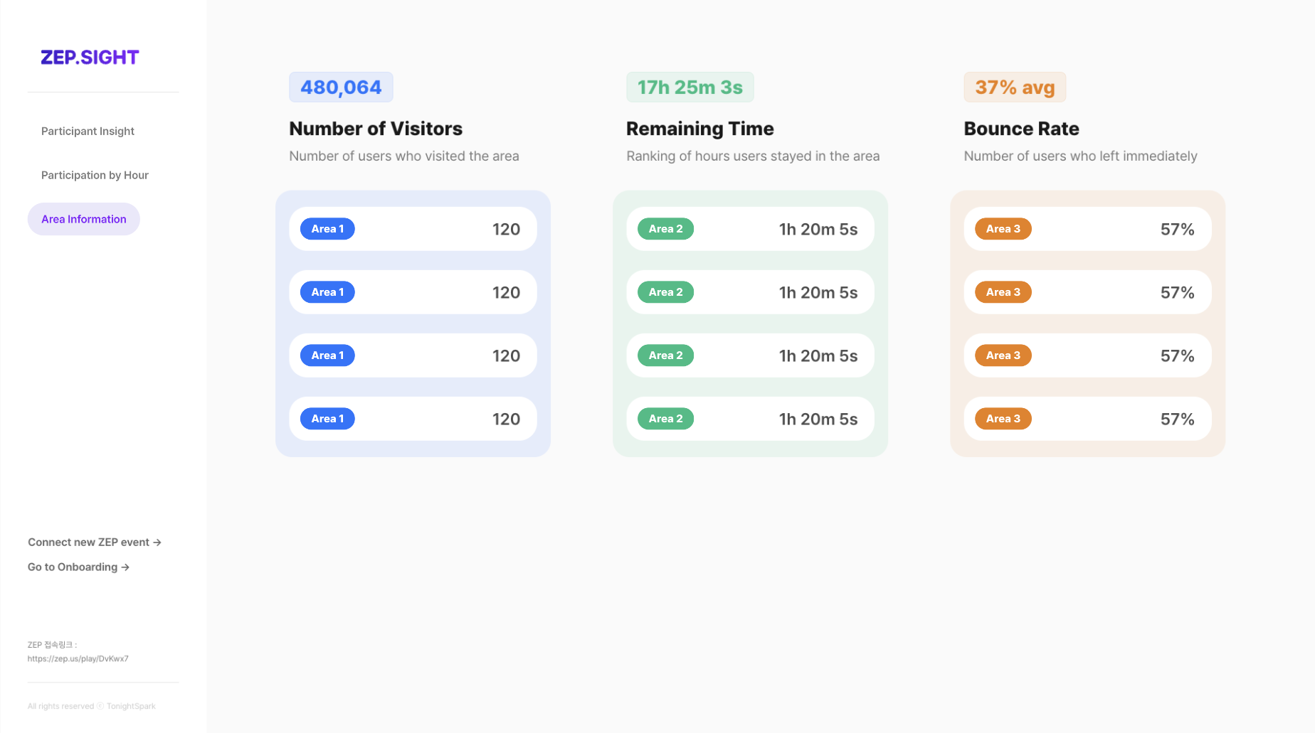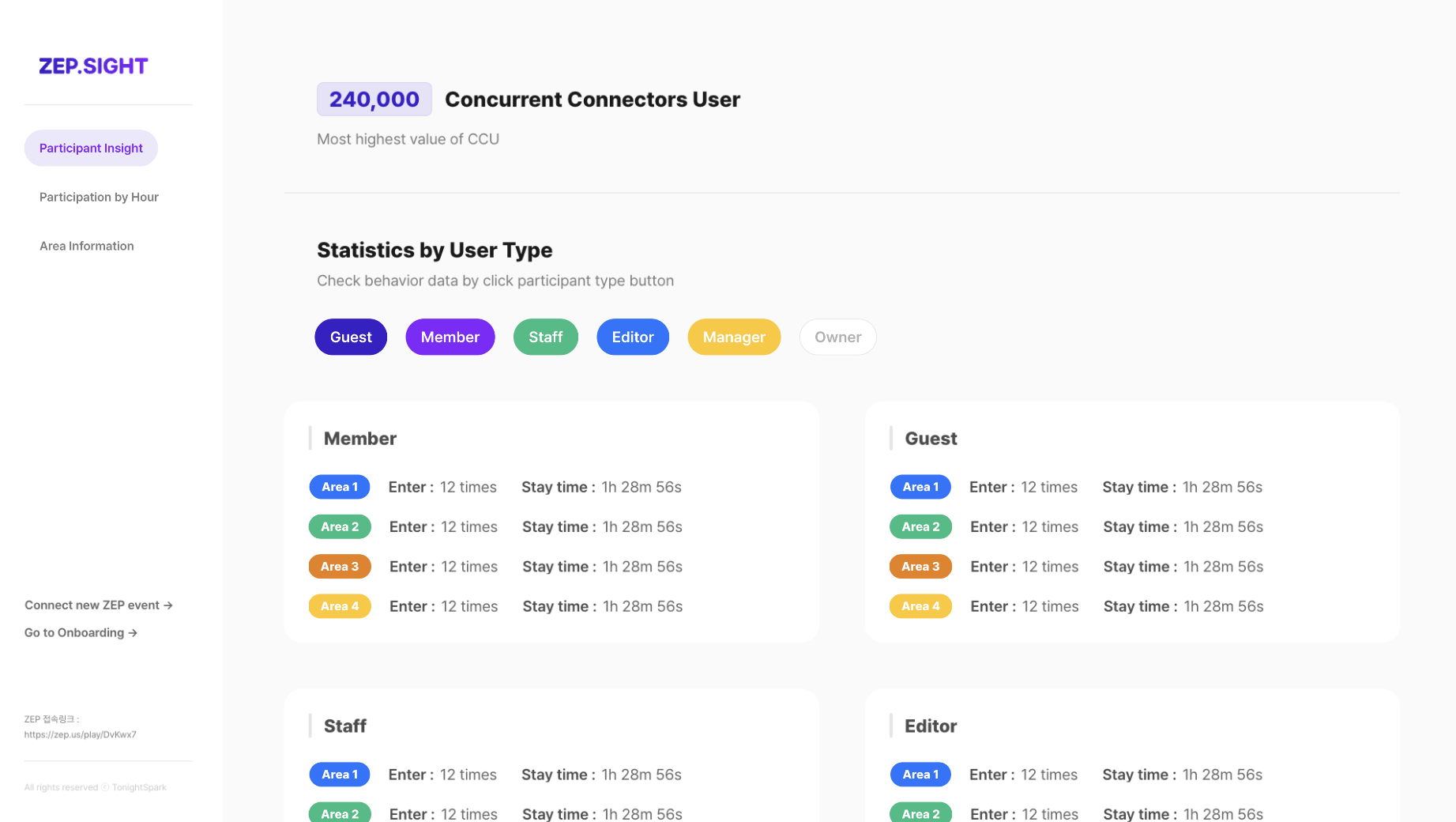 Through our service, ZEP administrators can see the object-related data, classified by participants, time, and areas.