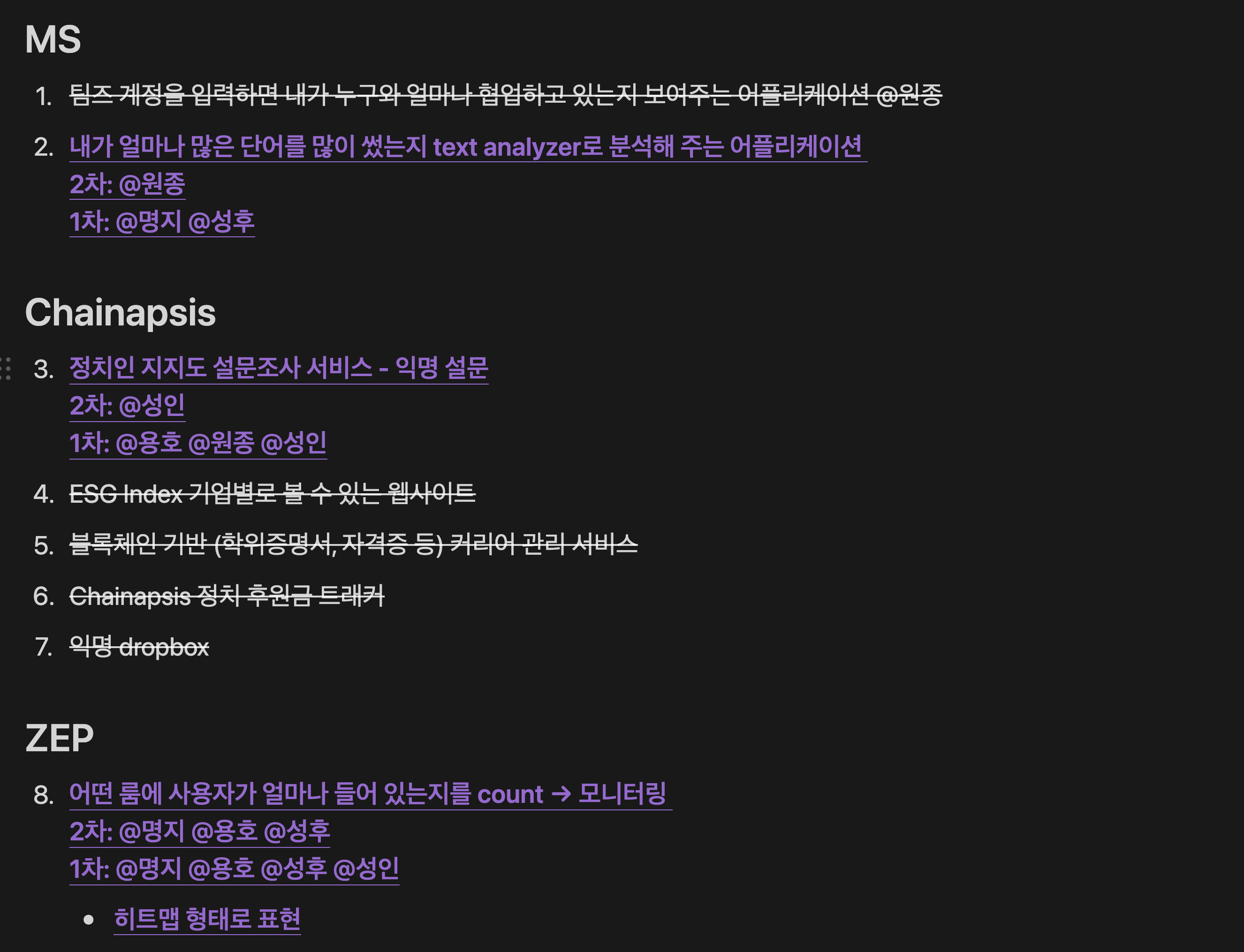8개의 아이디어를 바탕으로 간단하게 아이디어 제안자가 설명하고 기술적인 검토를 빠르게 하면서 이게 가능/불가능 한지 여부를 따져본 후 1차 선택을 했다. 그 때 각 트랙별로 하나씩 아이디어가 남았고 이 세 가지 아이디어를 조금 더 deep dive 해보면서 결과적으로 ZEP 트랙을 선택하게 되었다. 개인적으로 나는 ZEP을 이번 해커톤 이전에 써본 적이 없어서 되게 생소했고 선택할 것이라고 전혀 예상을 못 했는데 팀에서 과반수 이상이 선택해서 이 결정은 따르기로 했다.