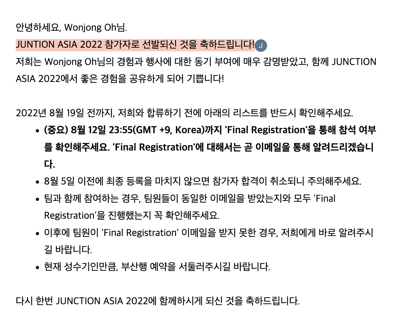 여담으로, 결과 발표가 7월 31일에 나온다고 했는데.. 그날 저녁까지 아무런 연락이 없어서 떨어진 줄 알았다. ㅠㅠ 그날 밤 9시 넘어서 이렇게 메일을 받고 팀원들과 자축했던 기억이 난다. ㅎㅎ 나중에 들어보니 해커톤 지원 과정에서도 경쟁률이 꽤 높았다고 했다고 한다.