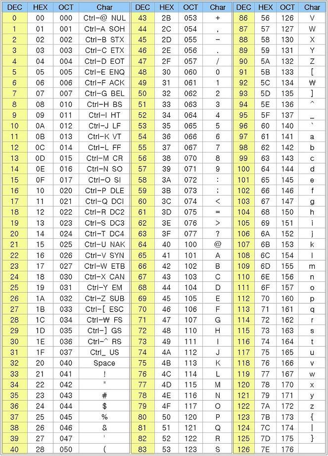 아스키 코드 표에서 몇 가지 재미있는 코드가 있다. 이런 코드들은 글자를 출력하는 데 쓰이지 않고 장치를 제어하기 위해 쓰이기 때문에 제어 문자(control character)라고 불린다.