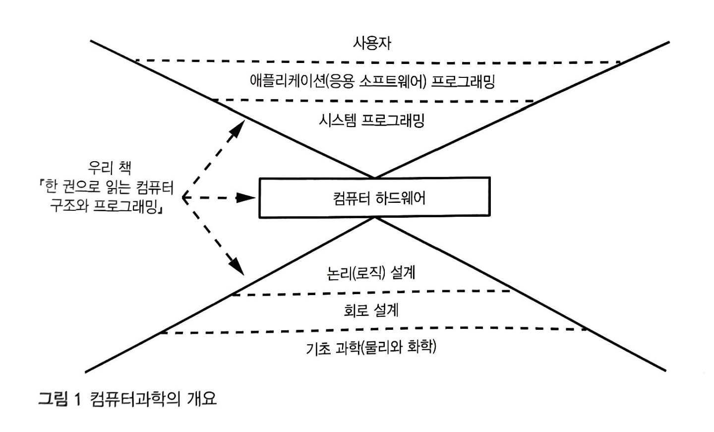 이 책에서 다루는 부분은 시스템 프로그래밍, 컴퓨터 하드웨어, 그리고 논리 설계이다. 시스템 프로그래밍은 어플리케이션 프로그래머가 사용하는 기본 요소를 만든다. 시스템 프로그래머는 자신이 작성하는 코드가 하드웨어와 상호작용해야 하기 때문에 하드웨어에 대해 알아야만 한다. 컴퓨터 하드웨어에는 계산에 필요한 부품만 있는게 아니라, 외부 세계와 연결하기 위한 부품도 있다. 컴퓨터 하드웨어는 논리로 표현된다. 이 논리는 컴퓨터 프로그램을 작성할 때 사용되는 논리로 표현된다. 이 논리는 컴퓨터 프로그램을 작성할 때 사용하는 논리와 같다. 컴퓨터의 동작을 이해하려면 논리가 핵심이다.