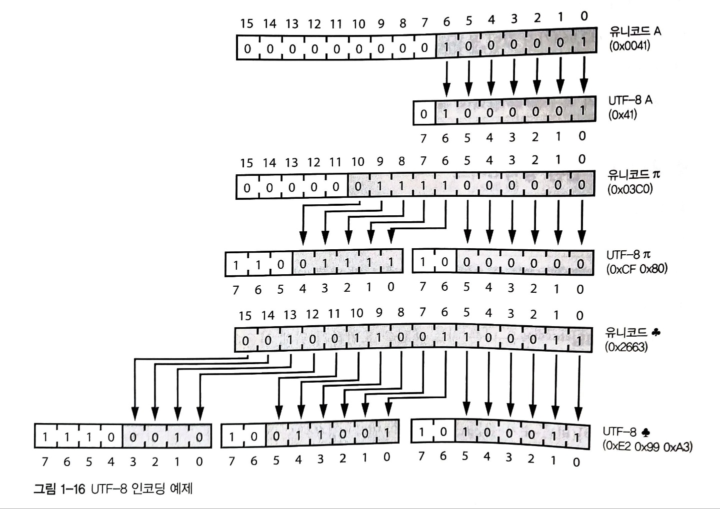 유니코드는 문자 코드에 따라 각기 다른 인코딩을 사용해 8비트로 저장된 아스키 코드 문자를 16비트로 표현하여 문제를 해결한다. 인코딩(encoding)은 다른 비트 패턴을 표현하기 위해 사용하는 비트 패턴을 뜻한다. 우리는 비트 같은 추상화를 사용해 숫자를 표현하고, 숫자를 사용해 문자를 표현하며, 다시 다른 숫자를 사용해 이런(문자를 표현하는) 숫자를 표현한다.