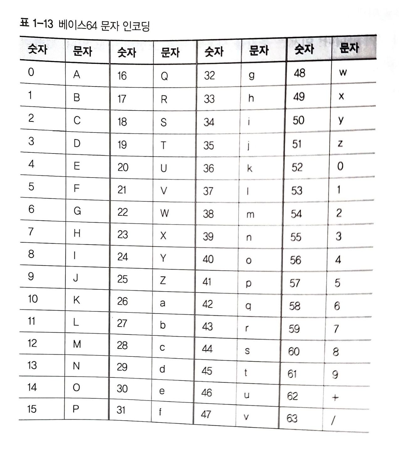 베이스64 인코딩은 3바이트 데이터를 4문자로 표현한다. 3바이트 데이터의 24비트를 네 가지 6비트 덩어리로 나누고, 각 덩어리의 6비트값에 출력 가능한 문자를 할당해 표현한다. 이 때 아래 표와 같은 변환을 사용한다.