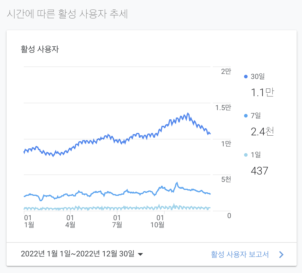 올 한 해 누적 사용자는 약 12만 명으로 작년 대비 19.0% 증가하였다. 내년에는 여기서 또 30% 성장해서 약 15만~16만 명 정도 방문하는 블로그를 만들어 보고 싶다.