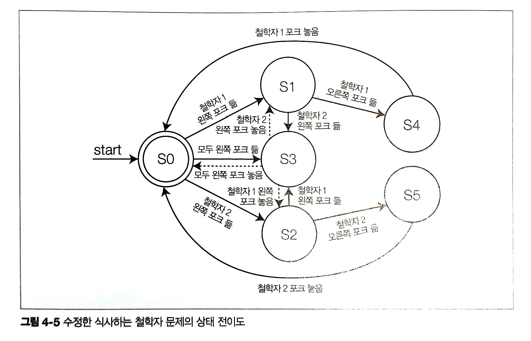 - 식사하는 철학자 문제는 스테이트 머신(state machine)에서의 상태 전이(state transition)