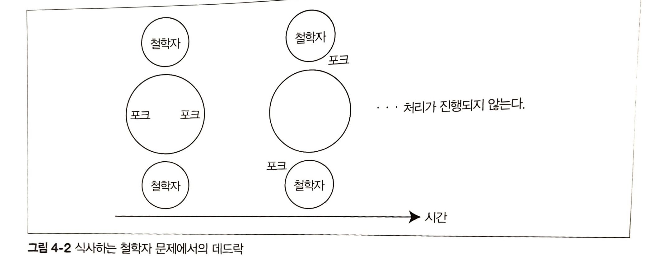 - 동시에 2명의 철학자가 왼쪽 포크를 들어 올린 뒤 오른쪽 포크를 계속 기다리게 되므로 더이상 처리가 진행 X
