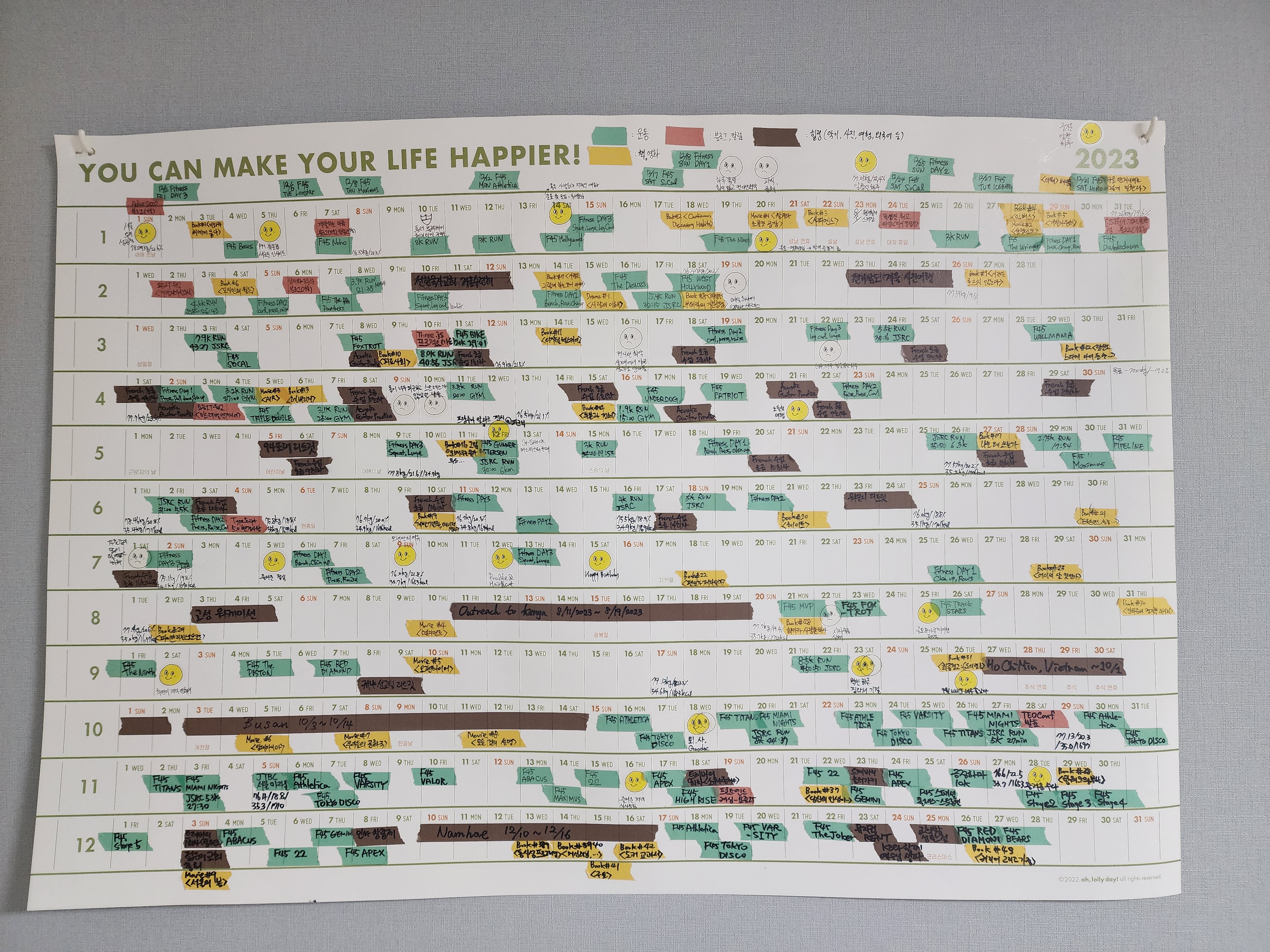 2023년을 시작하면서 오롤리데이라는 문구샵에서 1년치 큰 포스터 캘린더를 적기로 마음 먹었다. 내 삶의 흔적들을 색깔별로 마스킹 테이프를 통해 적고 나중에 한 해를 돌아볼 수 있게 만들어 보고 싶었다. 다행히도 올 해 말까지 이 캘린더를 잘 완성할 수 있었다. 부족한 부분도 참 많이 보였지만, 잘 다듬어서 내년에는 더 멋진 캘린더를 만들어 보고 싶다.