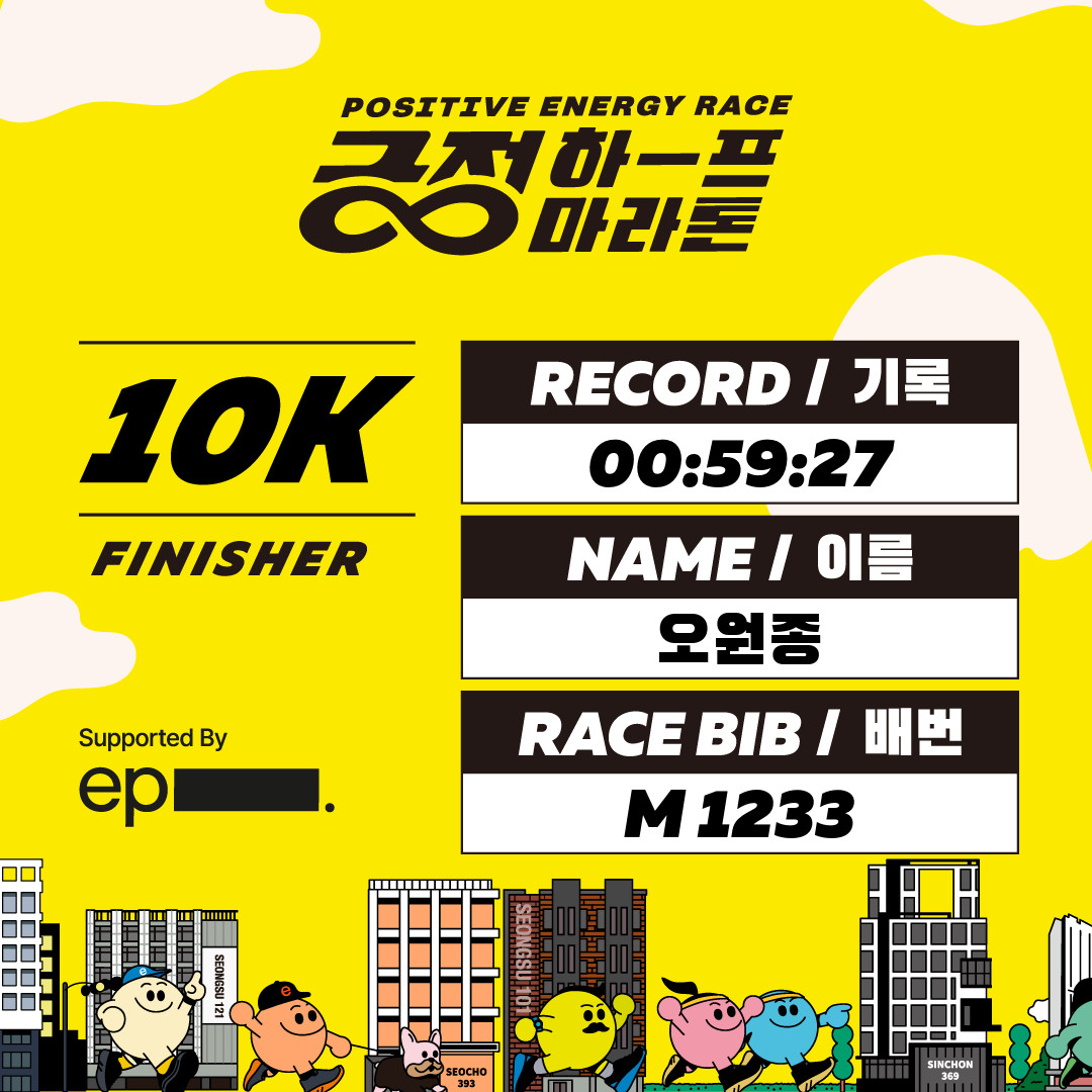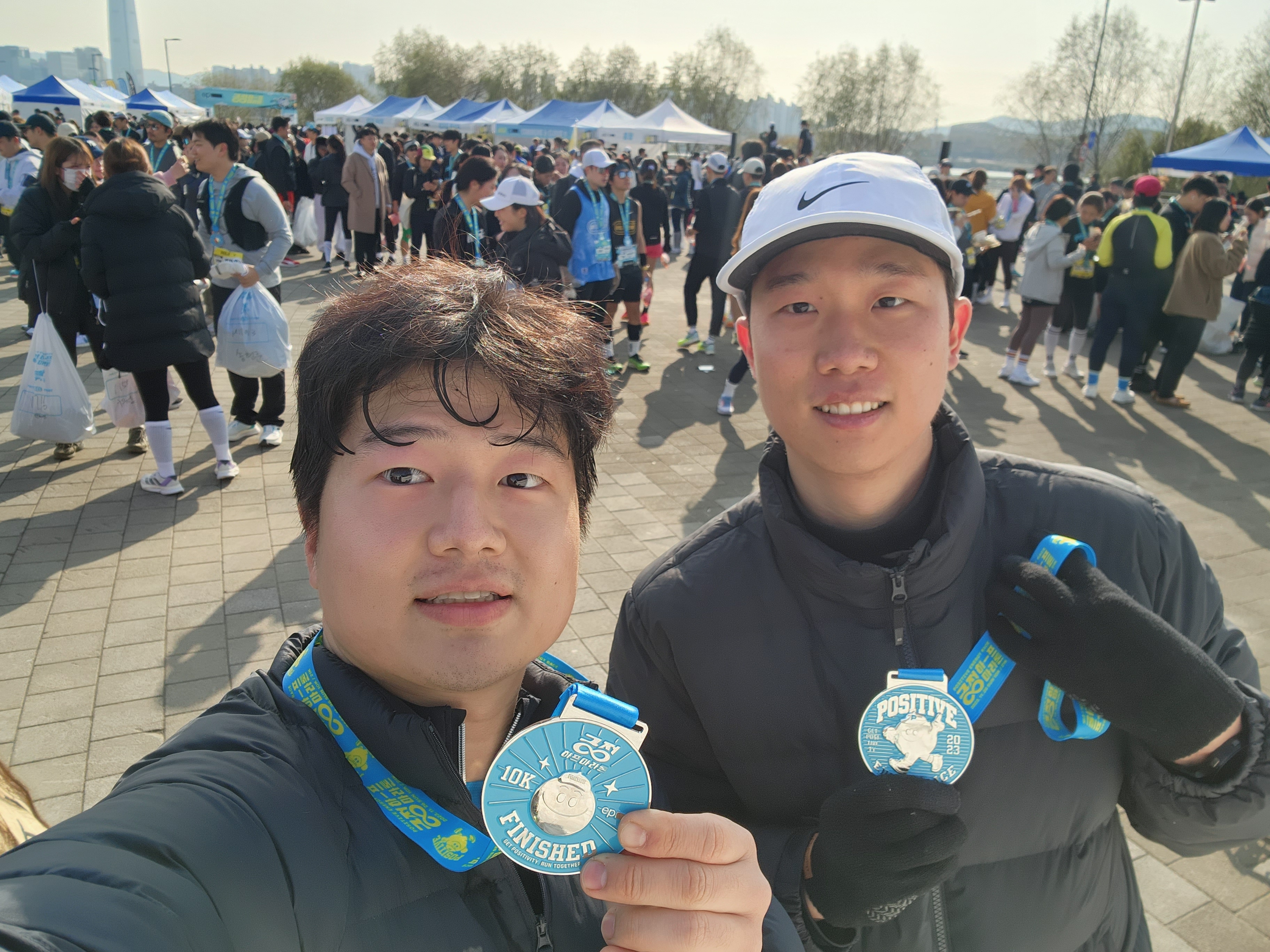 JTBC 마라톤의 아쉬움을 뒤로 하고 신청했던 3주 뒤 열린 긍정하프 마라톤. 결론부터 말하면 기록은 더 안나왔다 ㅋㅋㅠㅠ 그래도 재석이형을 오랜만에 만나서 너무 반가웠다. 재석이형이 나보다 더 잘뛰었는데, 본인도 본인 기록이 다소 아쉽다고 했던 기억이 난다.(부상 이슈) 이 날은 컨디션이 엄청 좋지는 않아서 직전까지 뛸까 말까를 고민했었다. 그리고 아침에 날씨가 너무 추워서, 되게 두껍게 입고 왔는데 뛰다보니 더워지고 무거워서 결론적으로 악영향을 미친 건 아닐까 생각이 든다.