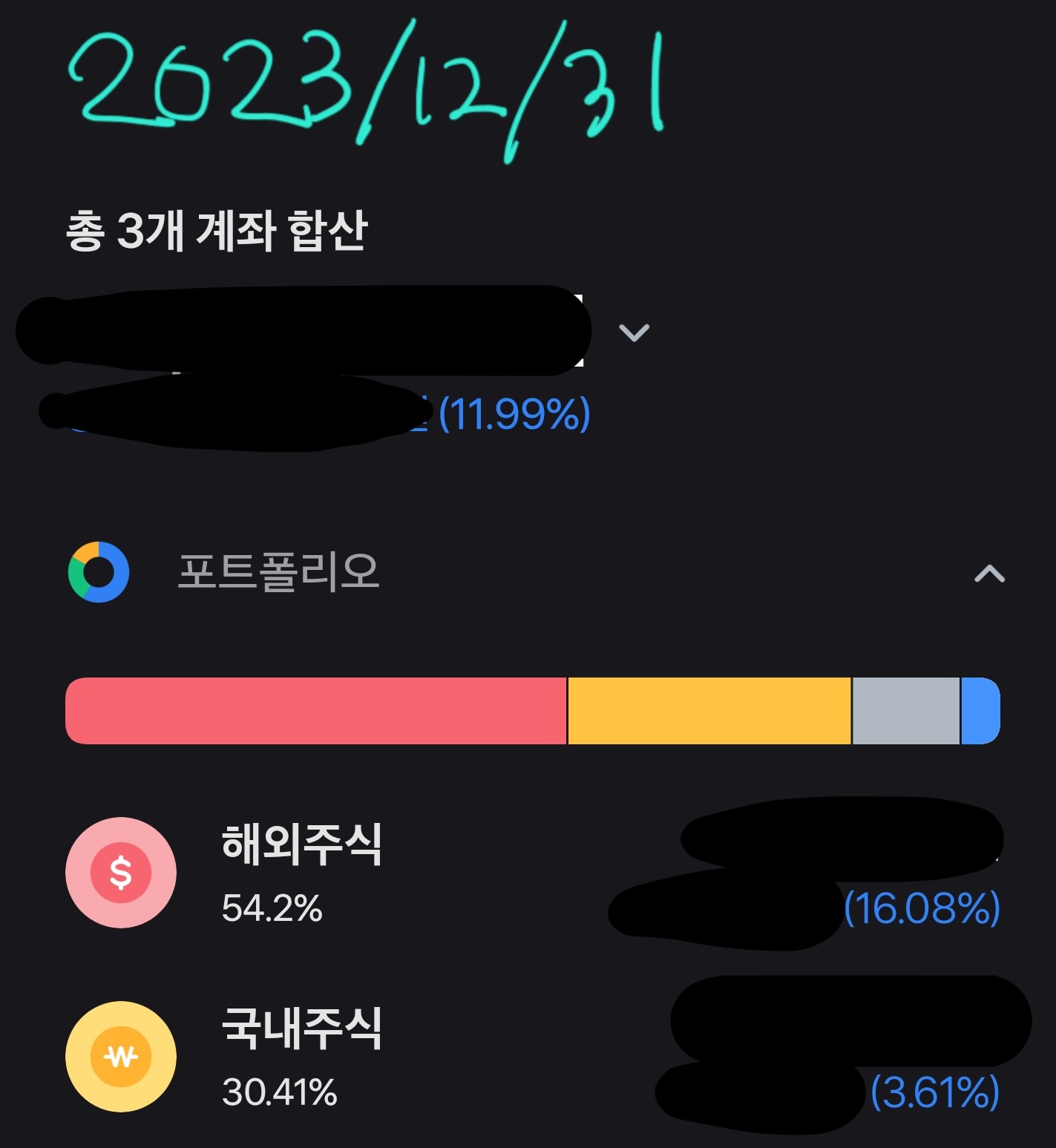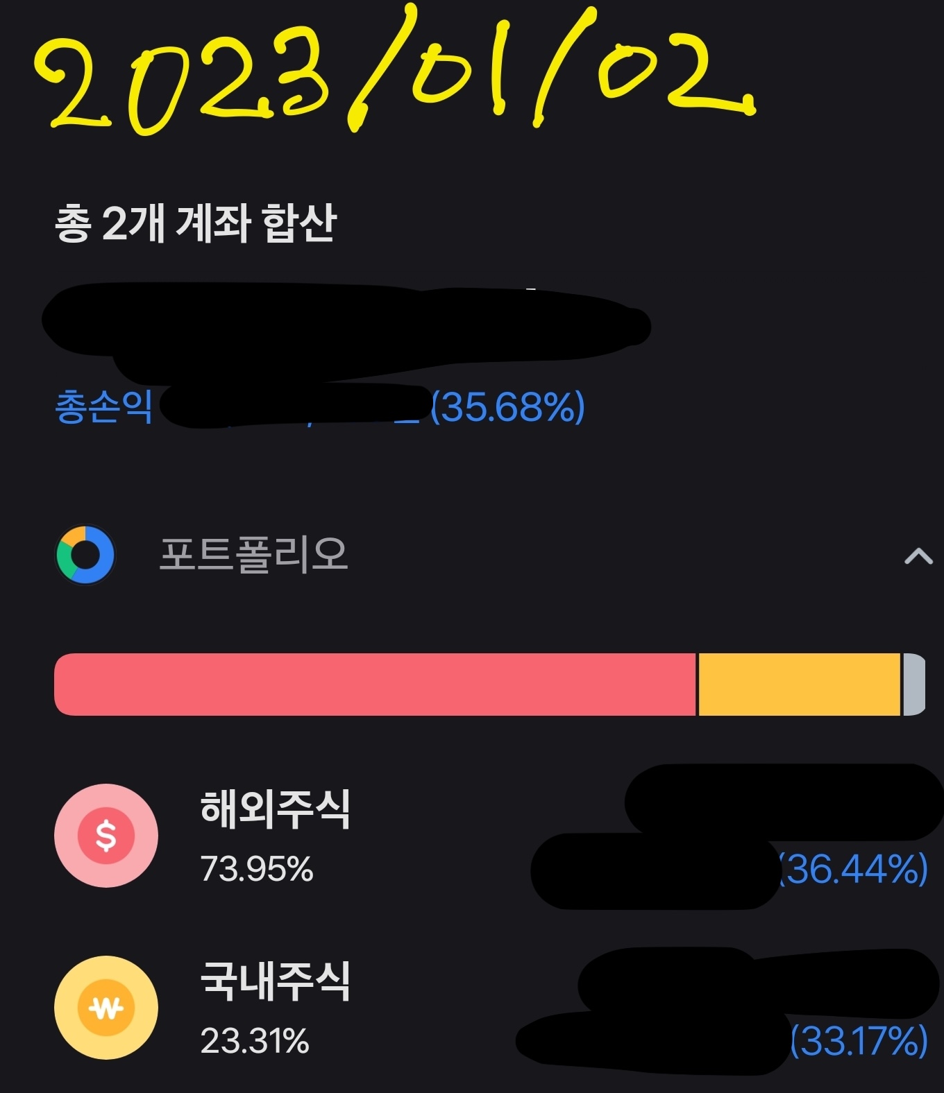 정확한 금액을 공개할 수는 없지만 전체 수익률은 -35.68% -> -11.99% 로 약 23.69% 증가했다. 하지만 여전히 마이너스다.