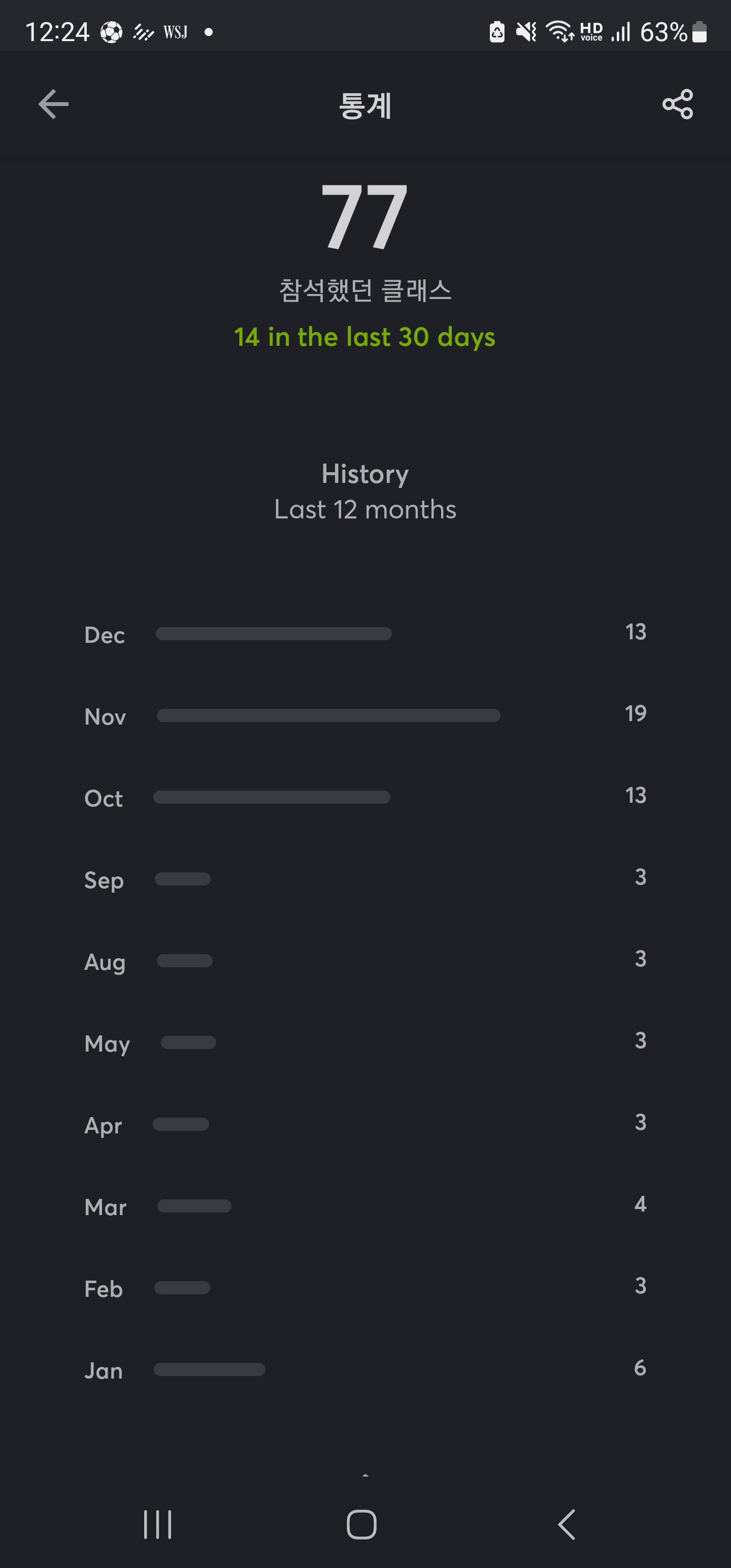 F45는 작년 말에 처음 시작해서 연초에 조금씩 나가다가 중간에 잠시 못 나갔다. 나는 꾸준하게 나오기는 어려워서 무제한 멤버십을 끊지 않고, 횟수권으로 끊어서 사용을 하는 편이다. 드문드문 나가다가 10월부터 멤버십을 끊고 꾸준하게 나가려고 노력했고 챌린저스도 참여했다. F45를 좋아하는 이유는 프로그램을 고민하지 않고 그냥 가서 열심히만 하면 되기 때문이다. 운동 가기 전 생각을 할 필요가 없고, 운동이 시작되면 복잡한 생각을 안 할 수 있게 해주는 매력이 내가 F45를 내년에도 꾸준하게 하게 되는 이유가 되지 않을까 생각이 든다.