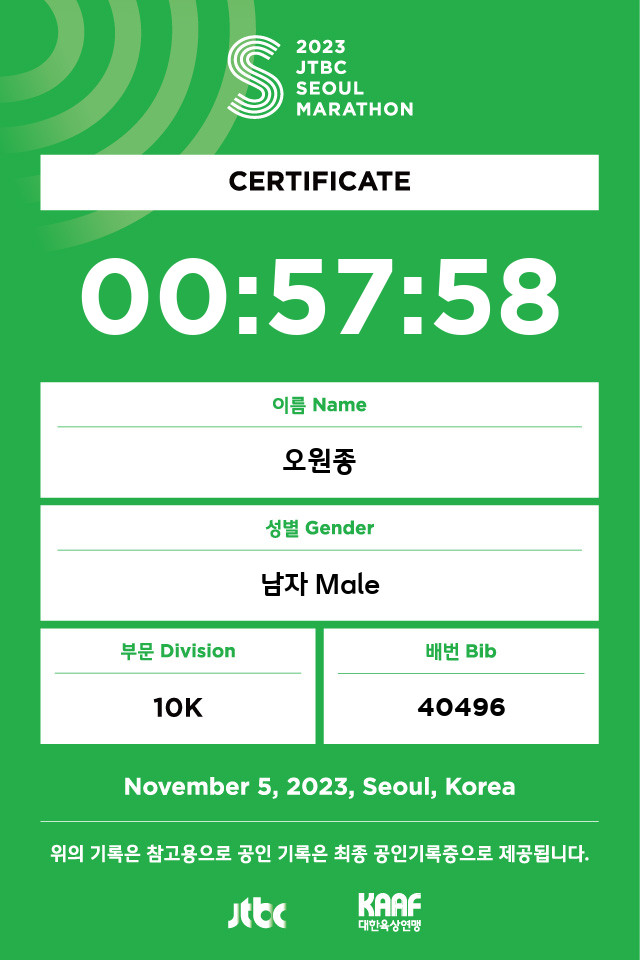 2023 JTBC 서울 마라톤 (11월 5일): 00:57:58
