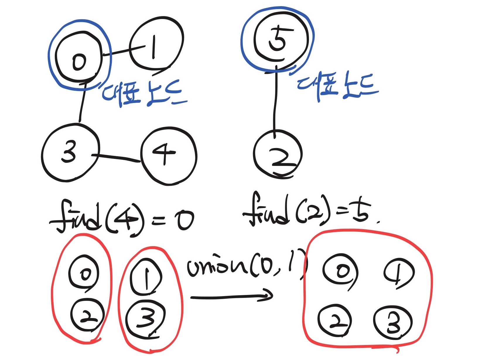 그리고 어떤 두 요소가 각각 속해있는 집합이 있다고 했을 때, 그 두 요소를 union() 메서드에 인풋으로 받으면, 그 두 집합의 합집합을 아웃풋으로 반환한다. 아래의 그림을 참고하면 된다.